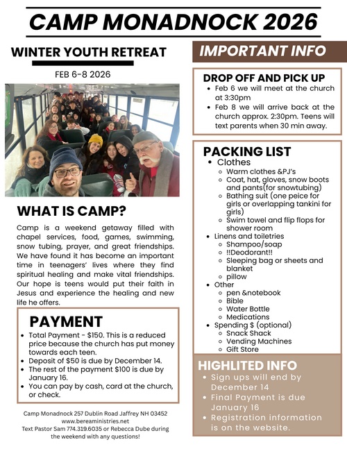 Each February we go to camp monadnock for our winter retreat. It is a weekend packed with times of worship and studying the Bible as well as games, snow tubing, and lots of food. We have found that there is a special move of God during these retreats where the students are able to discover a deeper sense of God's presence in their lives as well as love for one another.